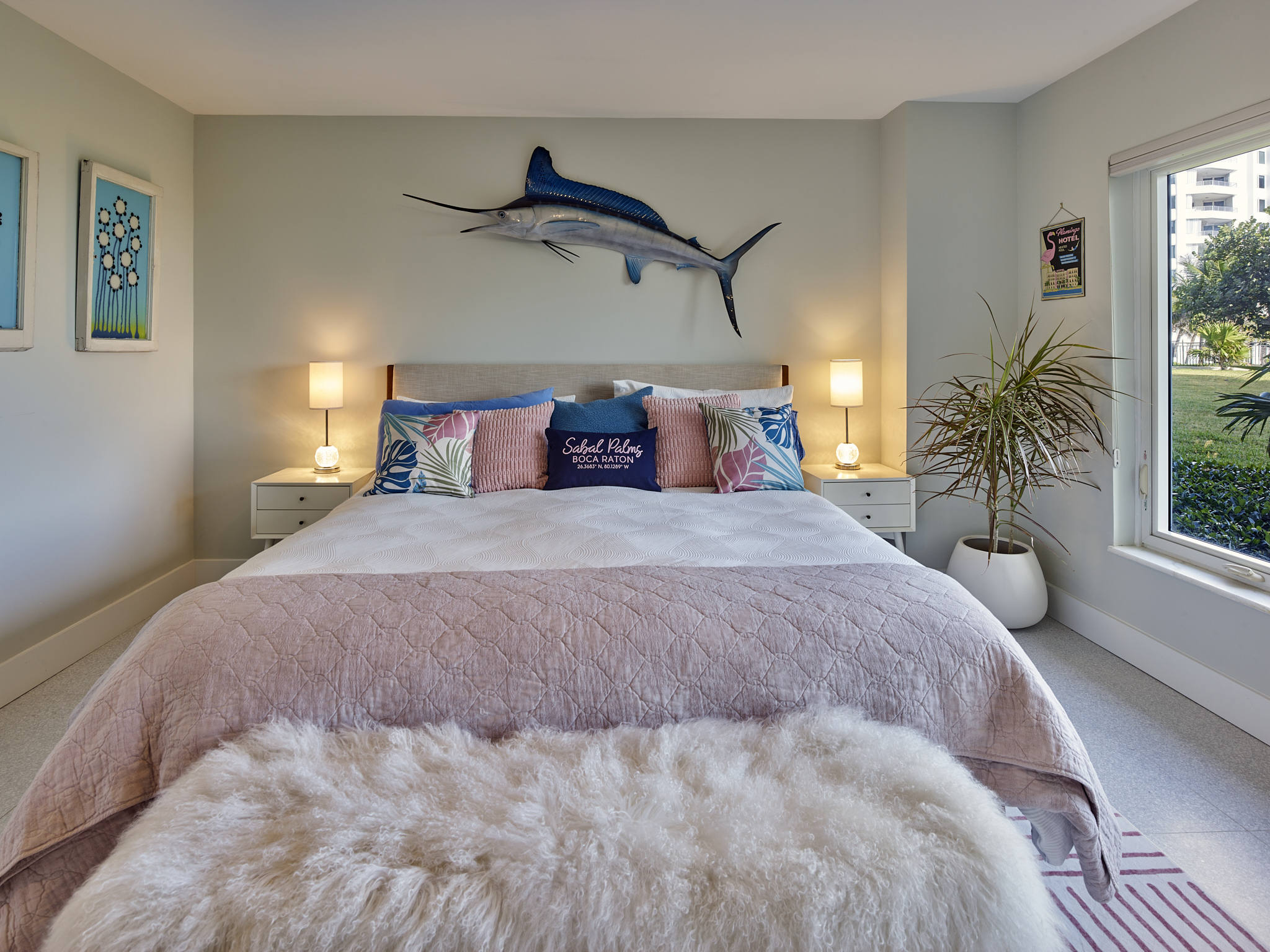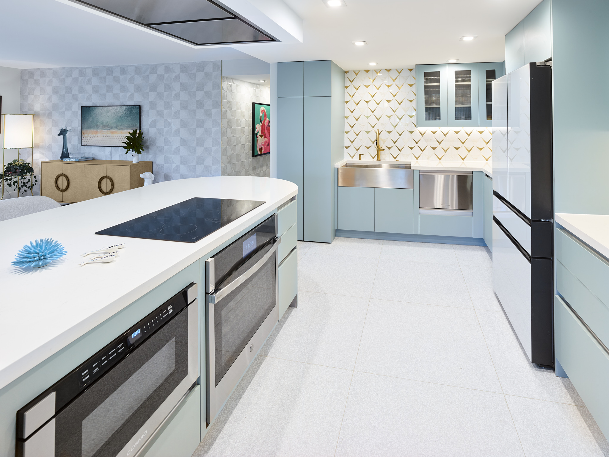 The material palette draws from the coast without resorting to the expected. Natural textures, blue and green hues, terrazzo, woven fibers, tactile stone, layer against clean modern lines and a festive color story. Every surface was chosen not just for how it looks, but for how it feels underfoot, under hand, in the changing light of a South Florida afternoon.
