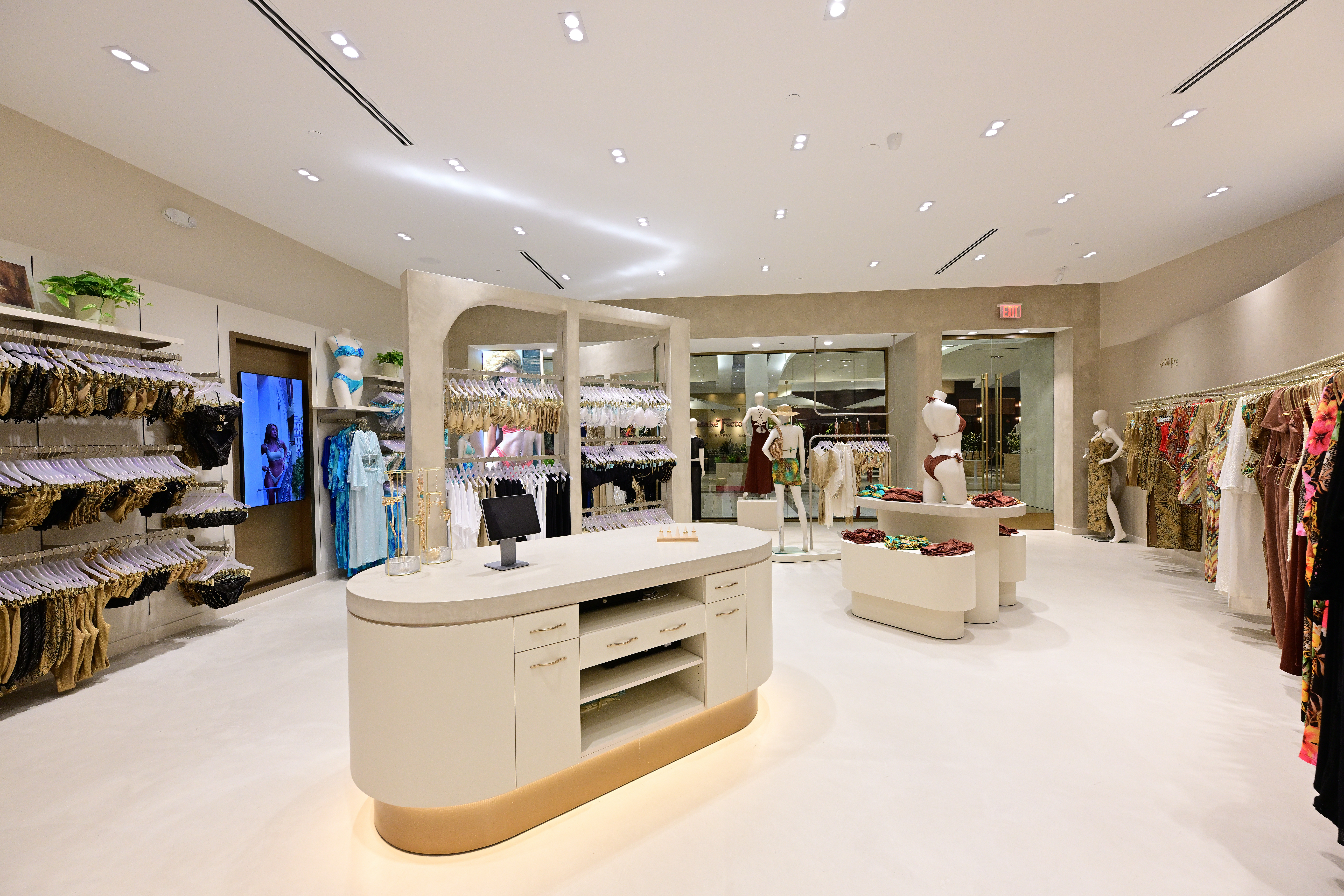 The design challenge was to create a clean, upscale environment while allowing the product to take center stage. Drawing inspiration from Miami’s tropical paradise and natural coastal elements, Neuvio Architects developed a minimalistic, modern aesthetic anchored in natural materials—sand, beach, and earth tones—that complement rather than compete with Luli Fama’s eclectic patterns, bold colors, and daring cutout designs.